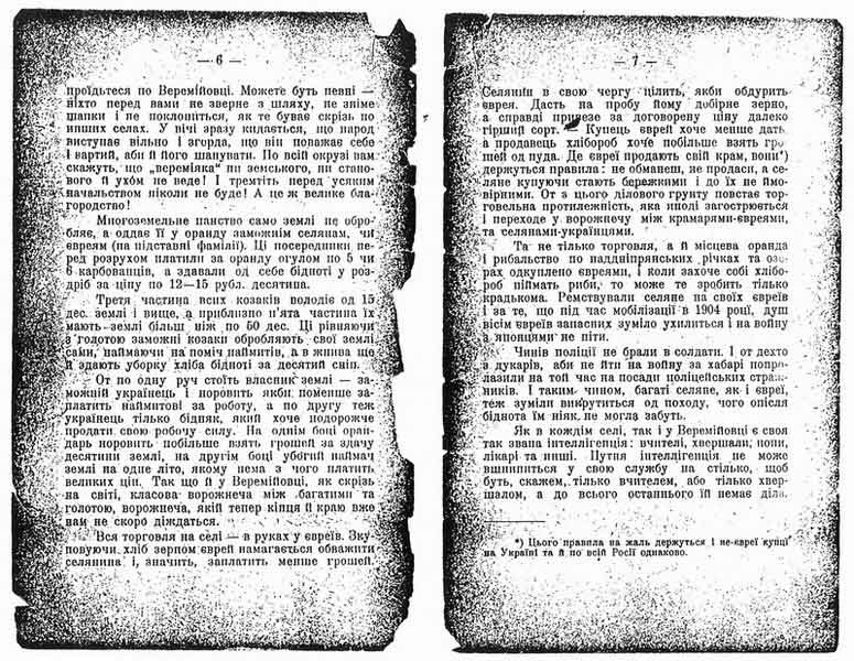 По всій Росії взагалі і над нашою Вкраїною зокрема над євреями, та єврейським питанням здавна висіла-тяжила хмара крівавих насильств та знущання, які иноді переходять у погроми. Темні убогі селяне нацьковуються місцями на „жида парху”, аби пролити кров і самим одвічать. А ті хто нацьковують селян на оте ганебне діло, хто не соромиться призвіщ: члена союза русскаго народа, чорносотенця, староправця і т. д., потім в пролитій жидівській крові топлять селянську ж волю, занапащають хліборобську долю.