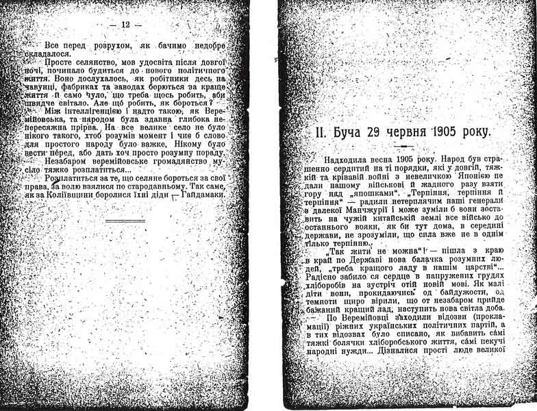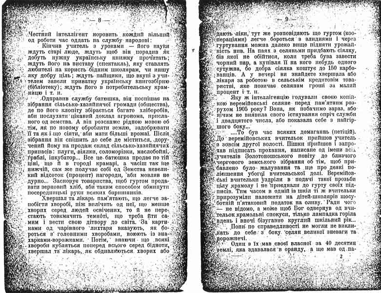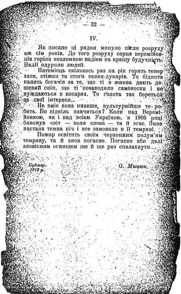 Не вміє вона инакше, культурнійше те робить. Бо відкіль навчиться? Коли над Веремійовкою, як і над всією Україною, в 1905 році блиснув світ – воля слова – та й згас. Знов настала темна ніч і все замовкло в її темряві.