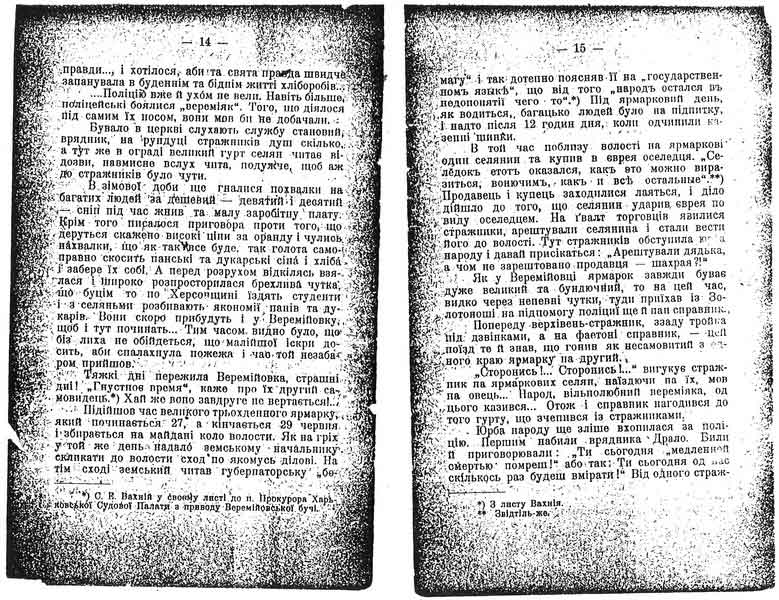 Так на чотирі місяці пізніш Веремійовського розруху Царським маніфестом дано було народу волю і все необхідне для того, щоб запанувала справжня констітуція. Вороги ж народу зразу піддурили його напасти на євреїв, наробити погромів. А як свого добилися, погроми ті широко прокотилися по всих усюдах нашої землі, то од їх же, тих ворогів, пішов гомін: „Мужики-дурні, до справжньої волі, до констітуції ще не доросли, коли скористалися першими ступнями нових порядків задля розбишацтва”...