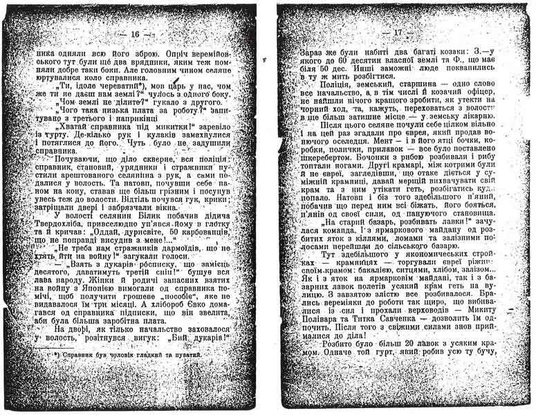 „Коли зовсім закінчився селянський розрух я чув, що приїзже начальство напустило козаків та й солдат на селян і б’ють їх, як сами хочуть. Два дні велася така розправа. Міні не було діла до волости, то сам я того не міг бачити. На третій день закортіло нарешті міні пройтися туди, та крім того в нас почта приходила на волость і міні час було поспитати собі корреспопденції. Прихожу у волость. Де ни взялися два стражника, підходять до мене і кличуть до справника. Не маючи жадного гріха за собою, я з світлим оком підступив до пана справника, аж чую: