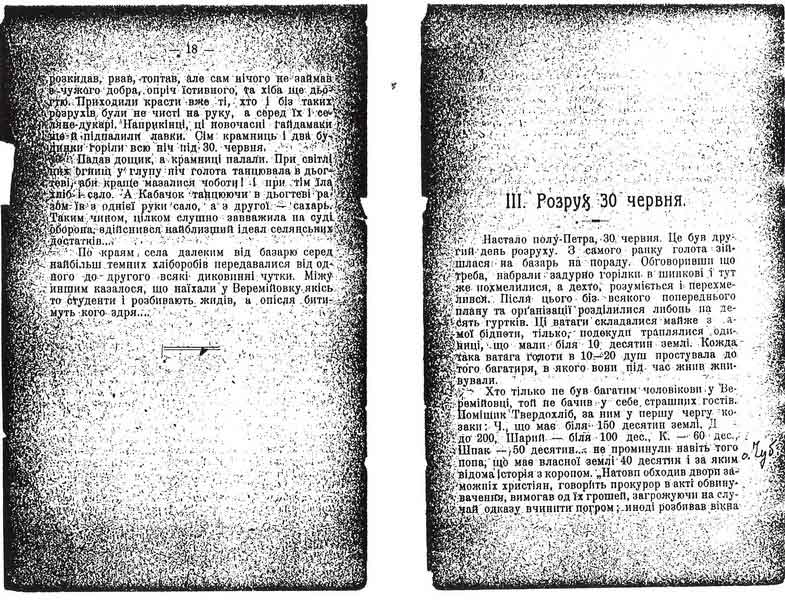 В перший день розруху розбита була лавка одного торговця й не єврея. Потім вийшло так, що всі панські стройки у яких поміщається крам і лавка крамаря не єврея згоріли до пня, а всі єврейські як є зосталися, цілі.