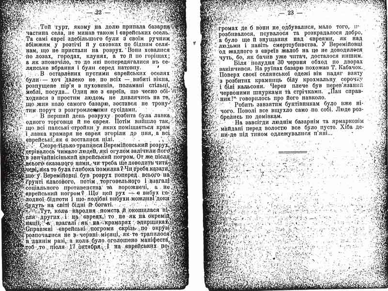 Тут, коли народня помста й окошилася після других і на євреях, то не як на окремій нації, а взагалі як на крамарях здирщиках. Справжні єврейські погроми скрізь по крузі розпочалися не в червні місяці, як те трапилося в даннім разі, а коли було оголошено маніфеста, тоб то після 17 октября. І на єврейських погромах де б вони не одбувалися, мало того, що розбивалося, псувалося та розкрадалося добро, а було ще й знущання над євреями, як над людьми і навіть смертоубивства. У Веремійовці од жадного з євреїв жалоб на це не доводилося чуть, бо, як бачив уже читач, досталося иншим.