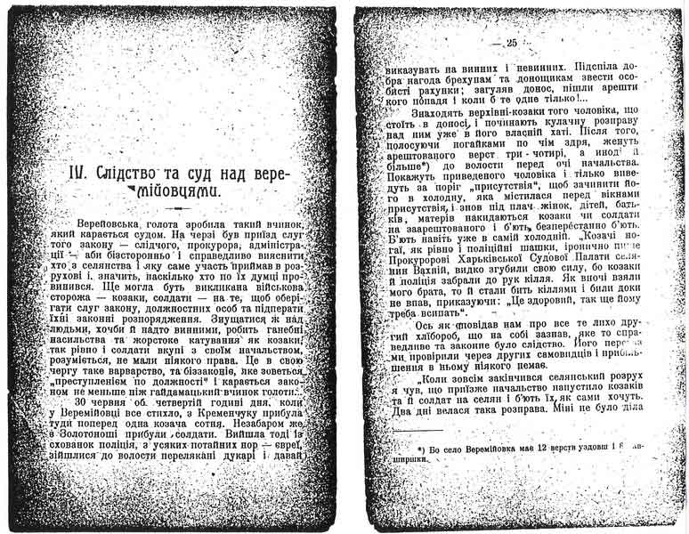 Ото ж суд над Веремійовськими селянами попав саме в ту чергу, коли підспіли діла справжніх погромщиків і Веремійовський розрух селянської голоти, цю новочасну Коліївщину, як ми вже казали, недалекозора публика не довго думаючи прийняла ни за що инше, як за єврейський погром. Так звалі ідейні люде зпоміж громадянства не хотіли й чути про веремійовців і тому оборонцям навіть ніяково було виступати на суді за Веремійовських селян. (Незабаром бо перед тим всі адвокати ухвалили погромщиків зовсім не обороняти). Порядному адвокатові приходилося міркувати собі: Доки суспільство (общество) дізнається, що веремійовське діло – чисте діло, а слава, недобра слава, буцім то застоював погромщиків розійдеться по світу.