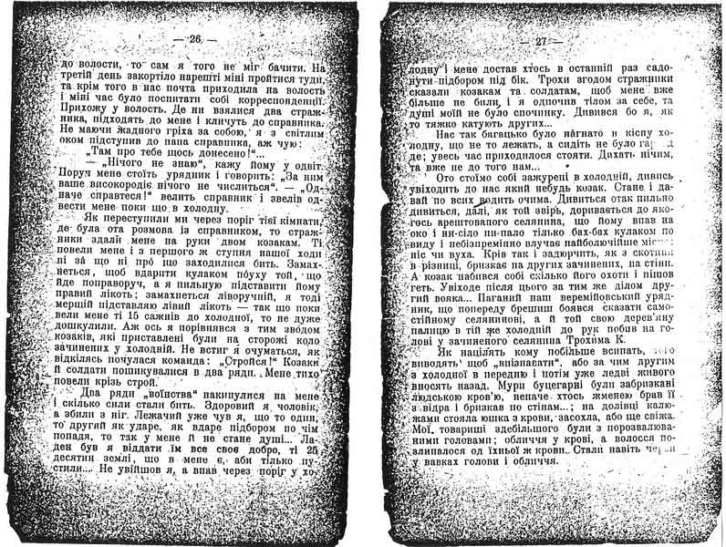 Ото стоїмо собі зажурені в холодній, дивись увіходить до нас який небудь козак. Стане, і давай по всих водить очима. Дивиться отак пильно дивиться, далі, як той звірь, доривається до якогось арештованого селянина, що йому впав на око і ни-сіло пи-пало тілько бах-бах кулаком по виду і небізпремінно влучає найболючіше місце: ніс чи вуха. Крів так і задюрчить, як з скотини в різниці, бризкає на других зачинених, на стіни. А козак набився собі скілько його охоти і пішов геть. Увіходе після цього за тим же ділом другий вояка... Паганий наш веремійовський урядник, що попереду брешиш боявся сказати самостійному селянинові, а й той свою дерев'яну палицю в тій же холодній до рук побив на голові у зачиненого селянина Трохима К.