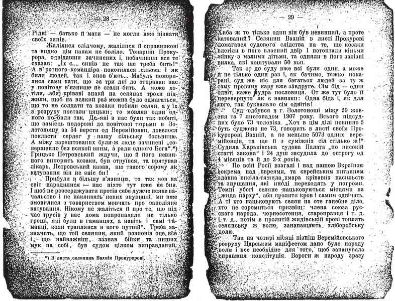 Як націлять кому побільше всипать, того виводять щоб „впізнавати”, або за чим другим з холодної в передню і потім уже ледві живого вносять назад. Мури буцегарні були забризкані людською кров’ю, неначе хтось жменею брав її з відра і бризкав по стінам...; на долівці калюжами стояла юшка з крови, засохла, або ще свіжа. Мої товариші здебільшого були з порозвалюваними головами; обличчя у крові, а волосся позлипалося од їхньої ж крови. Стали навіть у вавках голови і обличчя. Рідні – батько й мати – не могли вже пізнати своїх синів. Жалілися слідчому, жалілися й справникові, та видко цім панам не боліло. Товариш Прокурора, одвідавши зачинених і, побачивши все те сказав: „їх с... синів не так ще треба бить!” А в ротного командіра покотилася сльоза. І як били людей, так і знов б’ють... Мабудь поморилися сами кати, що за три дні до отправки нас у повітову в’язницю не стали бить. А може хотіли, аби кріваві знаки на селянах трохи піджили, щоб на всякий раз можна було одмагаться, що то не солдати та козаки побили селян, а у їх з розруху постали цяцьки; то мовляв один одного побили так. Деякі з нас були так побиті, що замісць подорожі до повітової тюрьми в Золотоношу за 54 версти од Веремійовки, довелося покласти сердег у нашу сільську больницю. А міжу зарештованих були ж люде зачинені „совершенно без всякої вини, а ради одного Бога”. (З листа селянина Вахнія Прокуророві). Грицько Петровський ждучи, що й його невинного випорють козаки, був отруївся, та врятував лікарь. ІІетровський казав, що такого сорому як катування він не зніс, би!